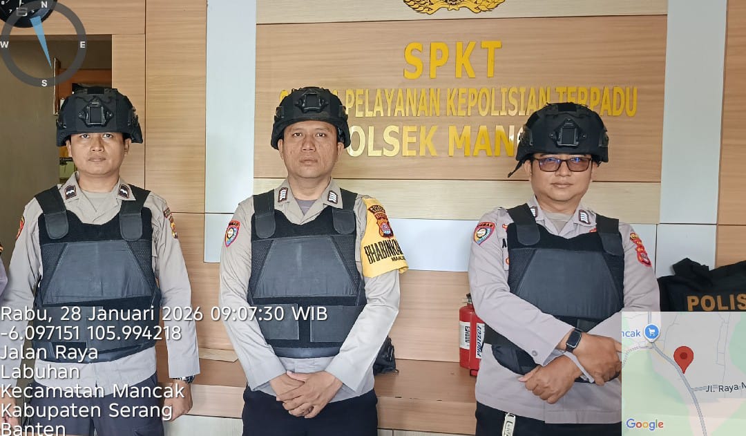 Anggota piket jaga Polsek Mancak AIPTU FANA.S, AIPDA HERMAN S, AIPDA DARSIWAN, BRIPKA ARIE, BRIGADIR ASEP melaksanakan sispam mako dengan bodyvest, helm kevlar, dan senjata api serta melakukan dan ini salah satu upaya peningkatan kemanan mako guna mencegah hal-hal yang tidak dapat di duga selama pelayan berlangsung.