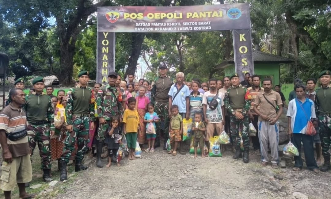 Suro-news.com,Natemnanu – Satgas Pamtas RI–RDTL Sektor Barat dari Yonarhanud 2 Kostrad Pos Oepoli Pantai melaksanakan kegiatan sosial dengan membagikan 150 paket sembako dan 150 paket snack kepada masyarakat yang membutuhkan di Desa Natemnanu Utara, Kecamatan Amfoang Timur, Kabupaten Kupang, Sabtu (18/04/2026).