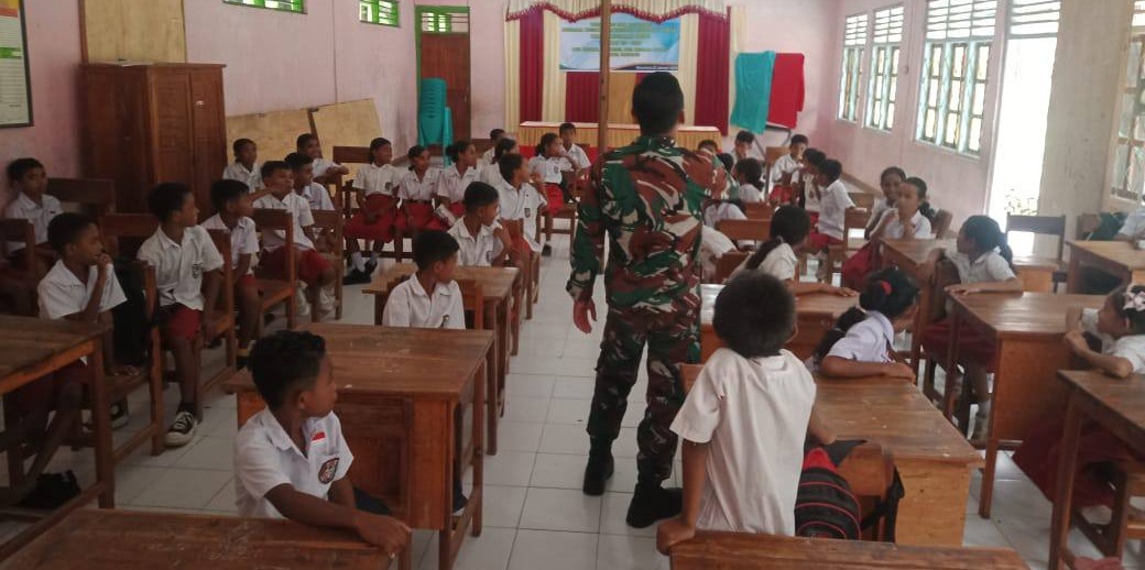 Suro-news.com Benus – Personel Satgas Pamtas RI–RDTL Sektor Barat Yonarhanud 2 Kostrad dari Pos Manamas melaksanakan kegiatan sebagai tenaga pendidik di SDK